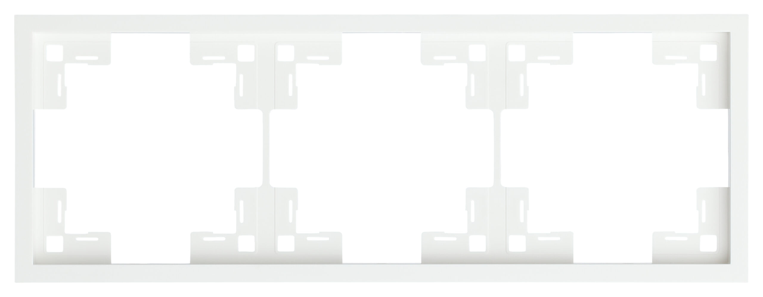 Рамка трехместная предназначена для установки трех механизмов, фиксируется на металлических суппортах механизмов и прижимается лицевыми панелями или клавишами.