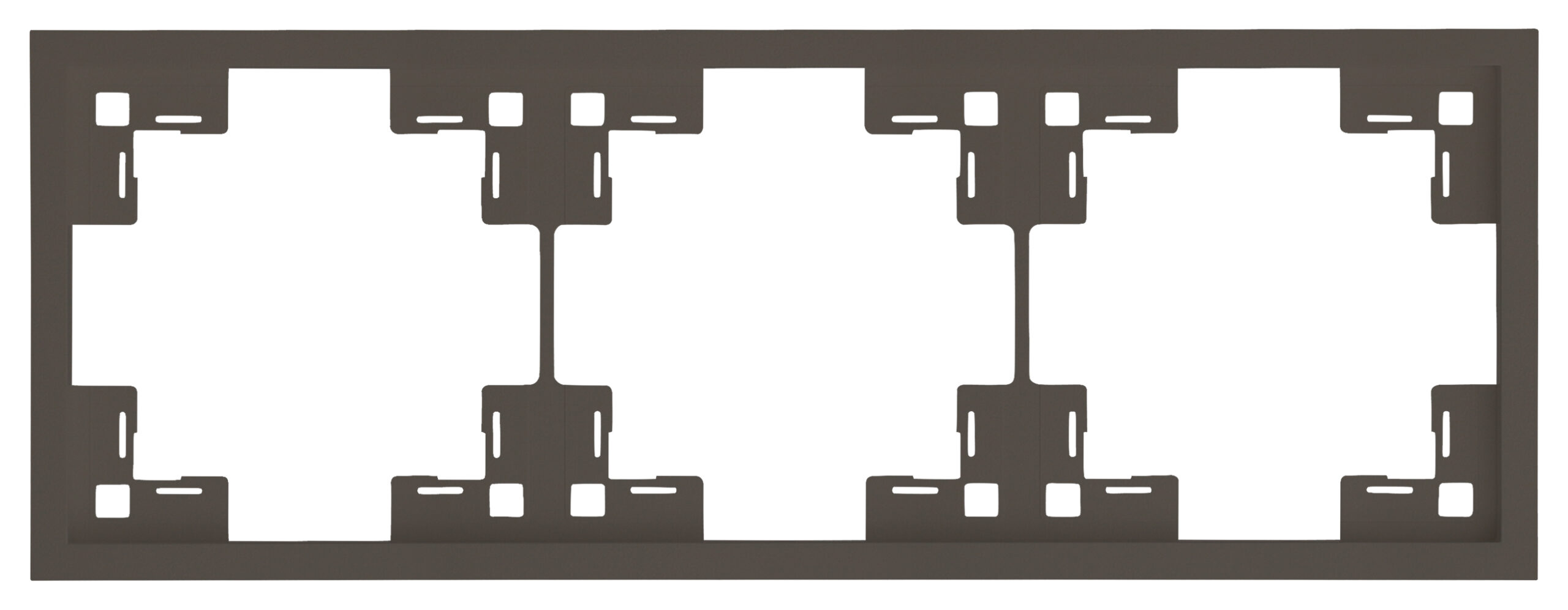Рамка трехместная предназначена для установки трех механизмов, фиксируется на металлических суппортах механизмов и прижимается лицевыми панелями или клавишами.